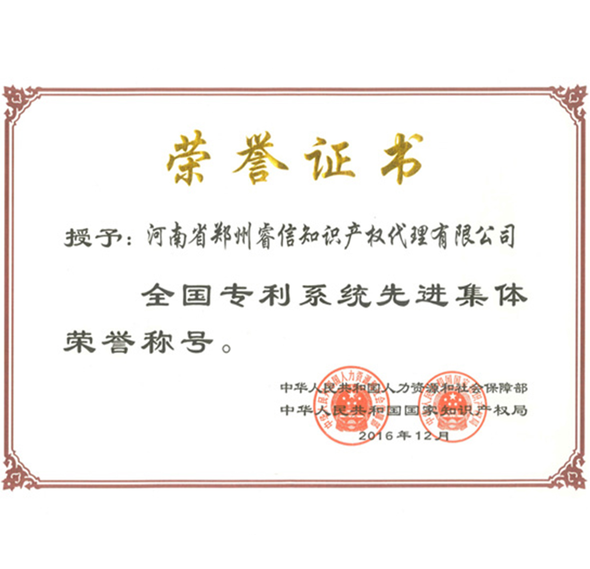 由人力資源和社會保障部、國家知識產(chǎn)權(quán)局聯(lián)合舉辦的全國專利系統(tǒng)先進集體和先進個人評選中,公司榮獲“全國專利系統(tǒng)先進集體榮譽稱號”。